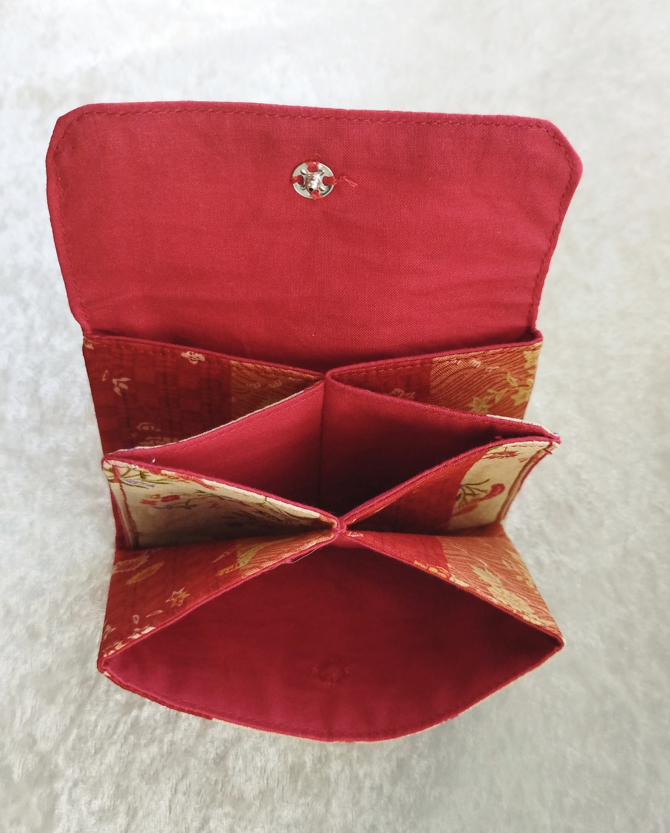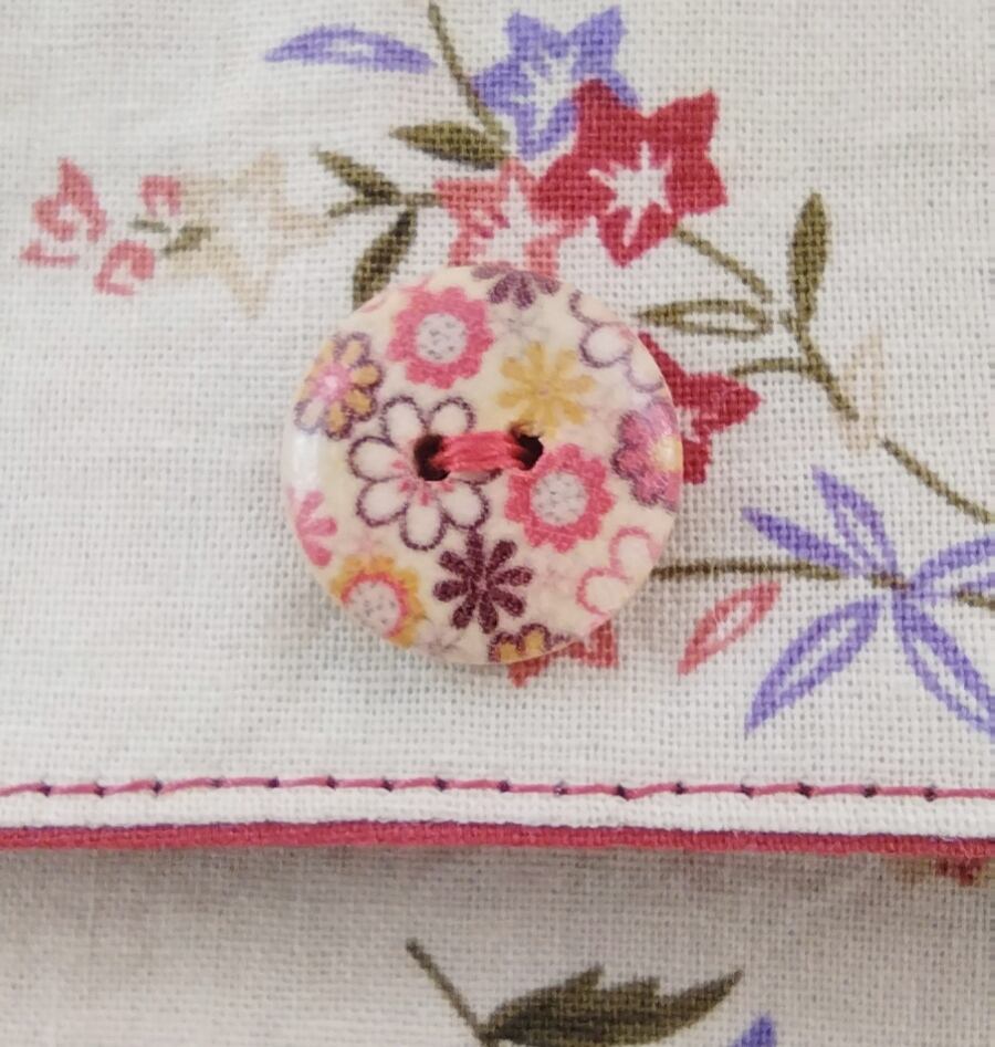 和柄のミニポーチです。カード入れにも、アクセサリーポーチにも使って頂けます。ポケット1箇所に、ブラスチック製カード、3〜4枚入ります。飾りボタンは、花柄のウッドポタンを使用しています。ちょっとしたプレゼントやお礼にも如何でしょうか?
