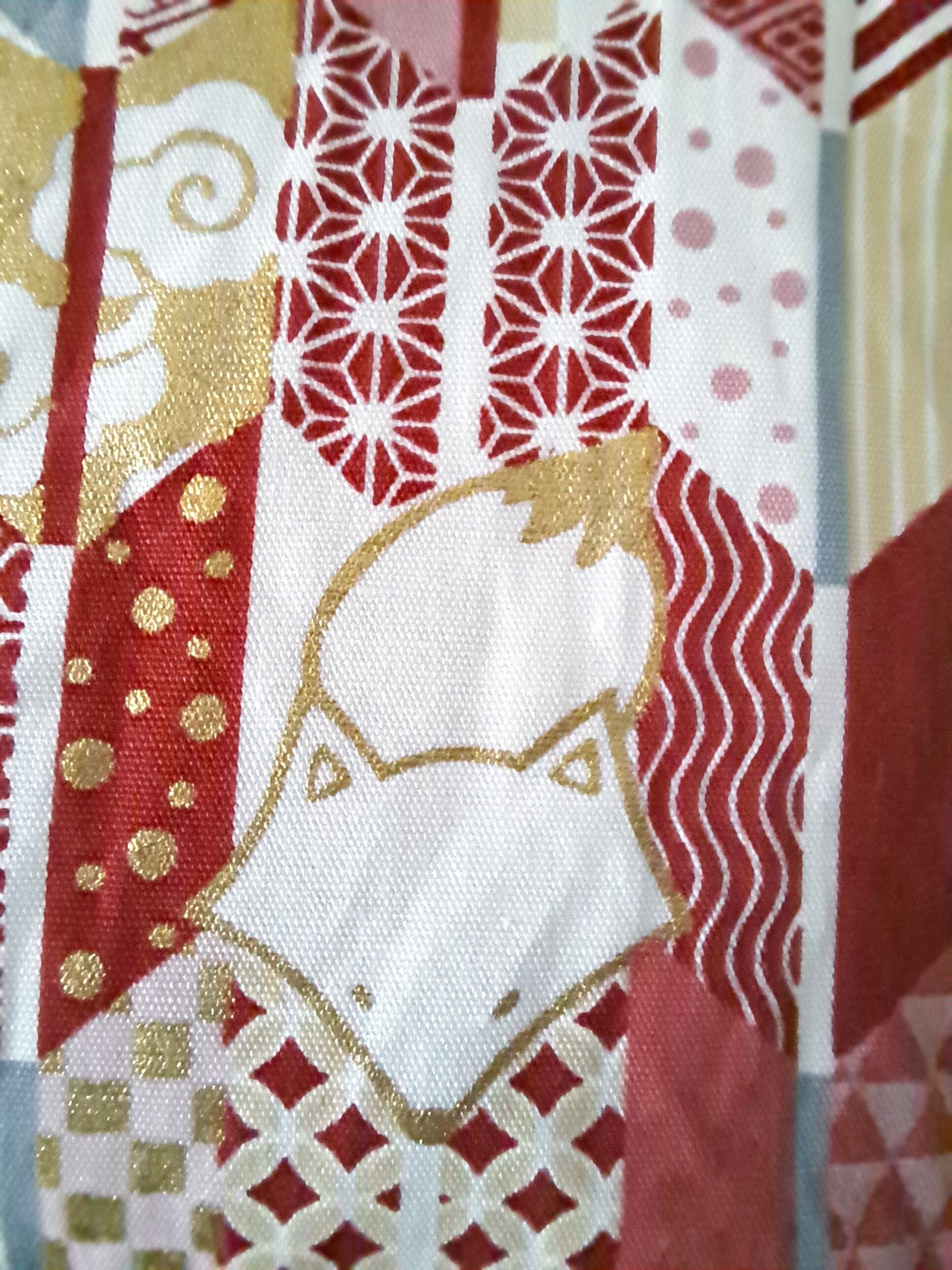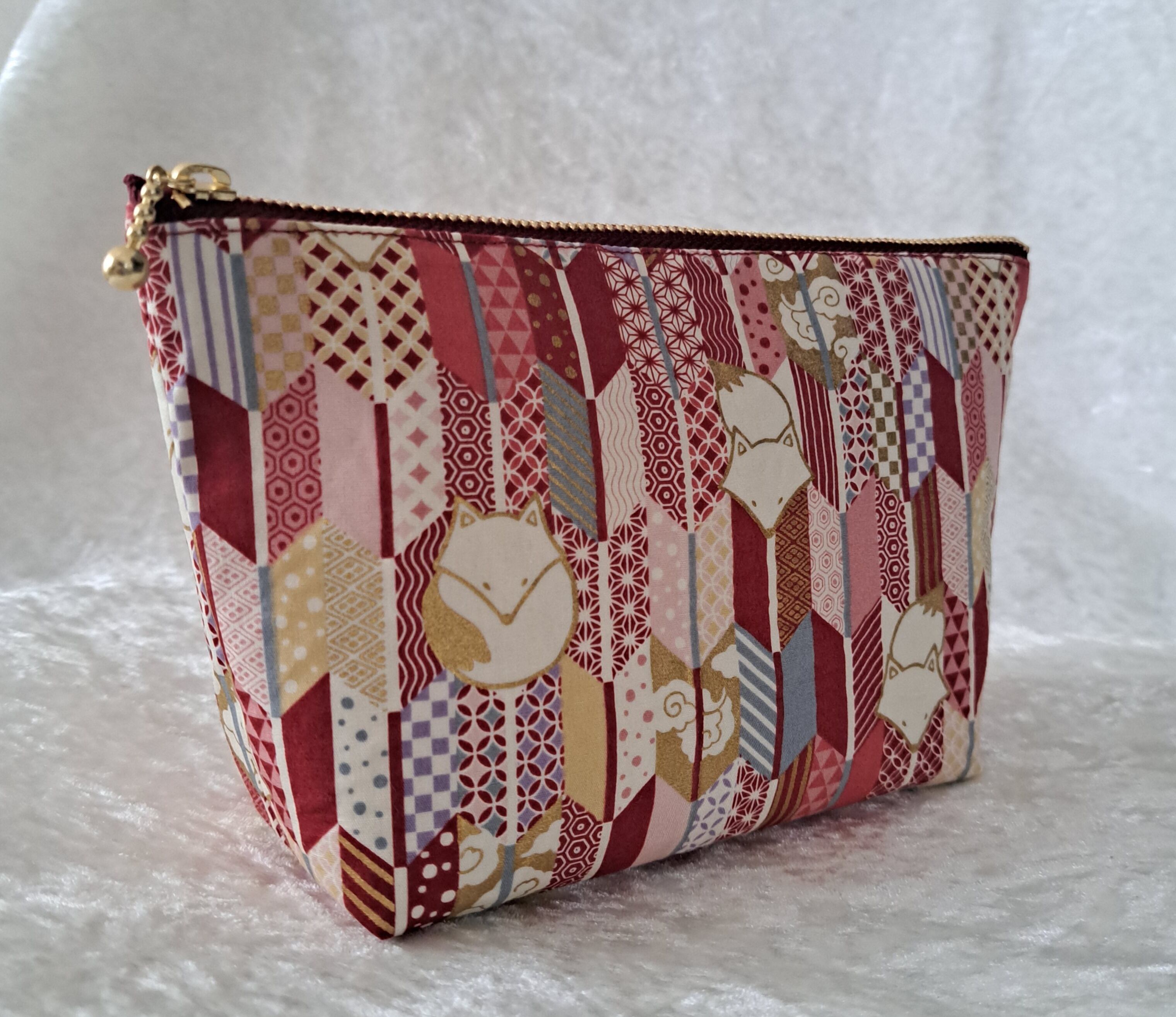 和柄のファスナーポーチです。矢絣の中にきつねがいます。
