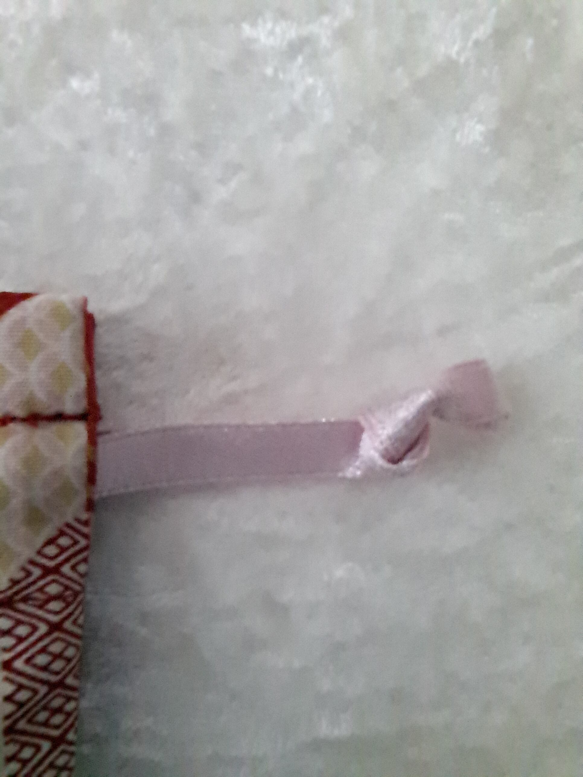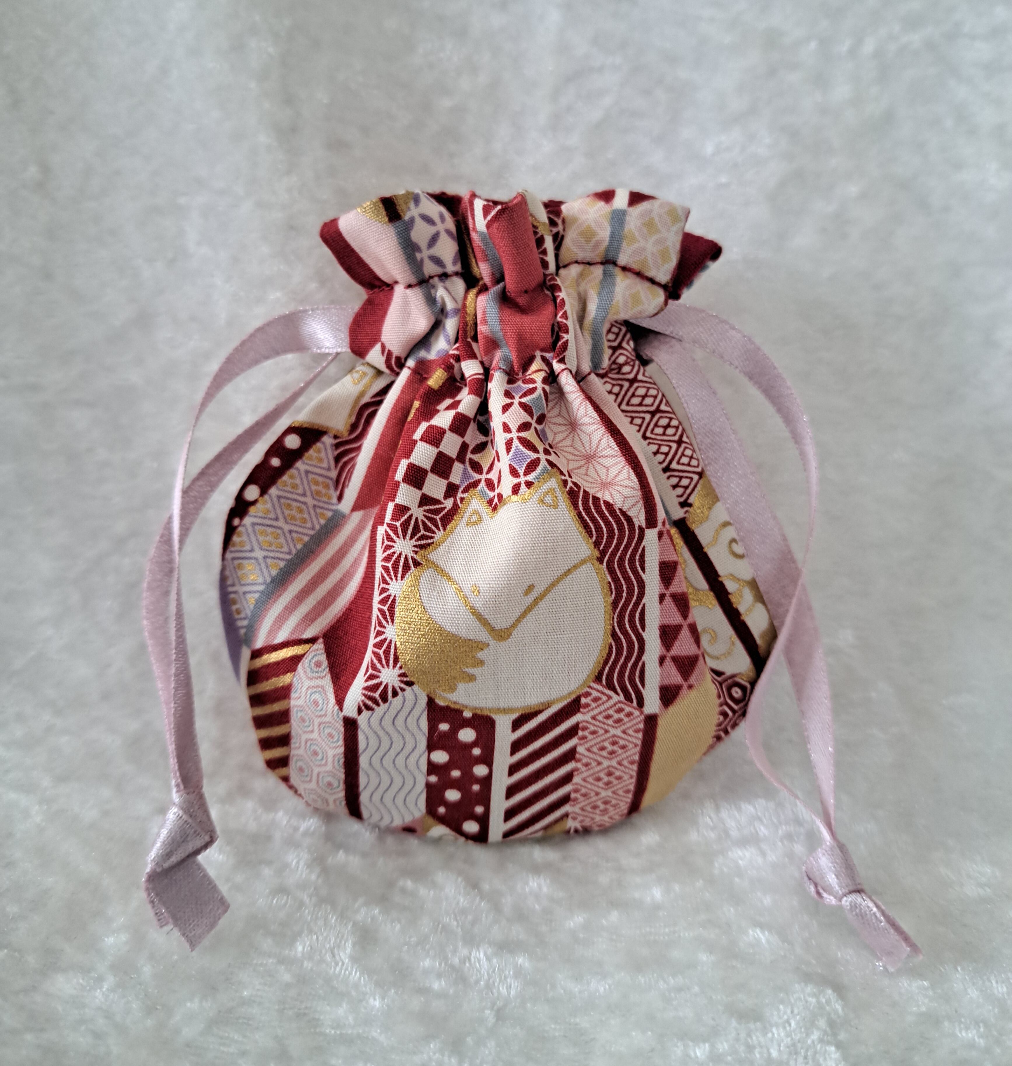 和柄のミニ巾着です。矢絣の中にきつねがいます。リボンはサテンリボンを使用しております。