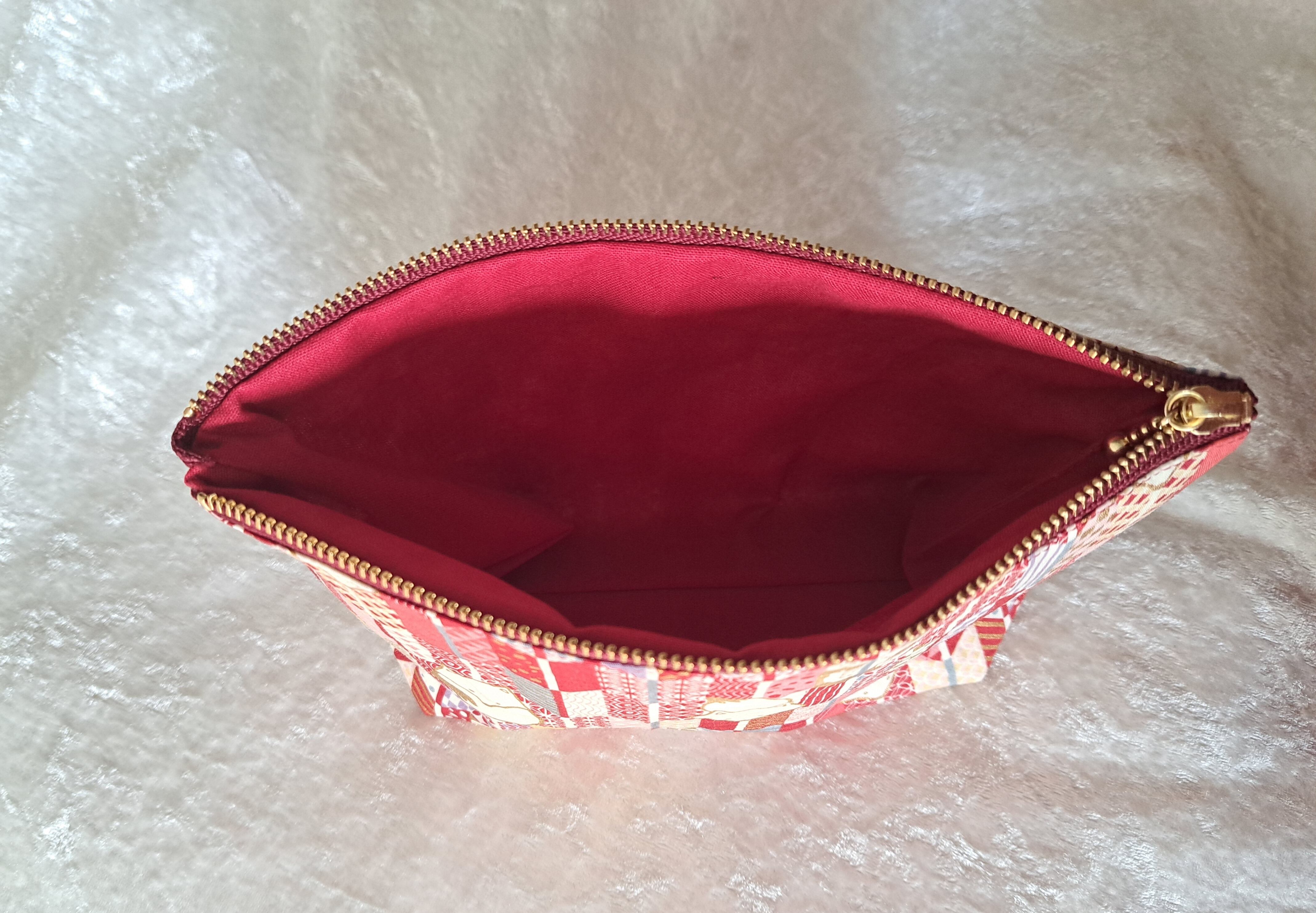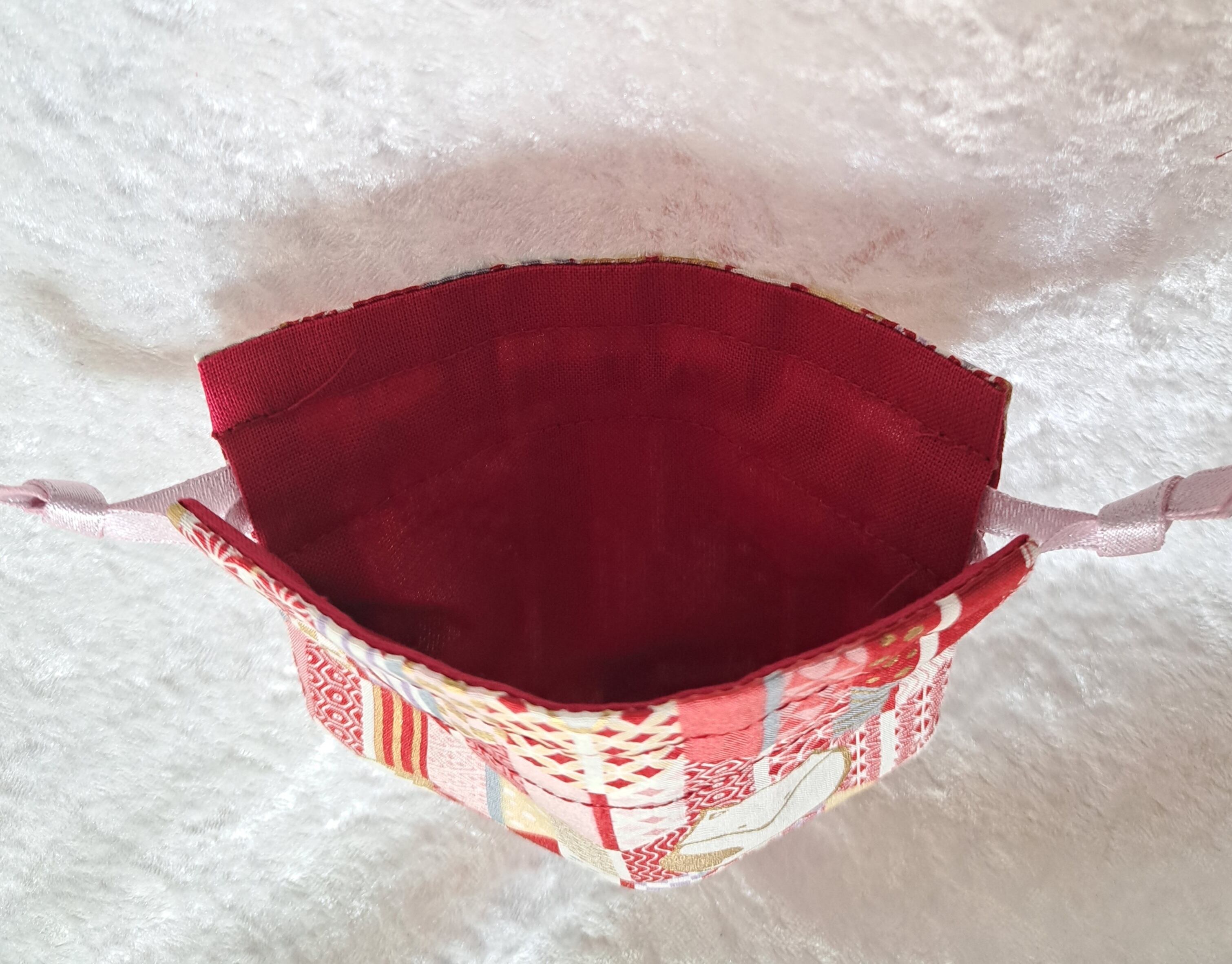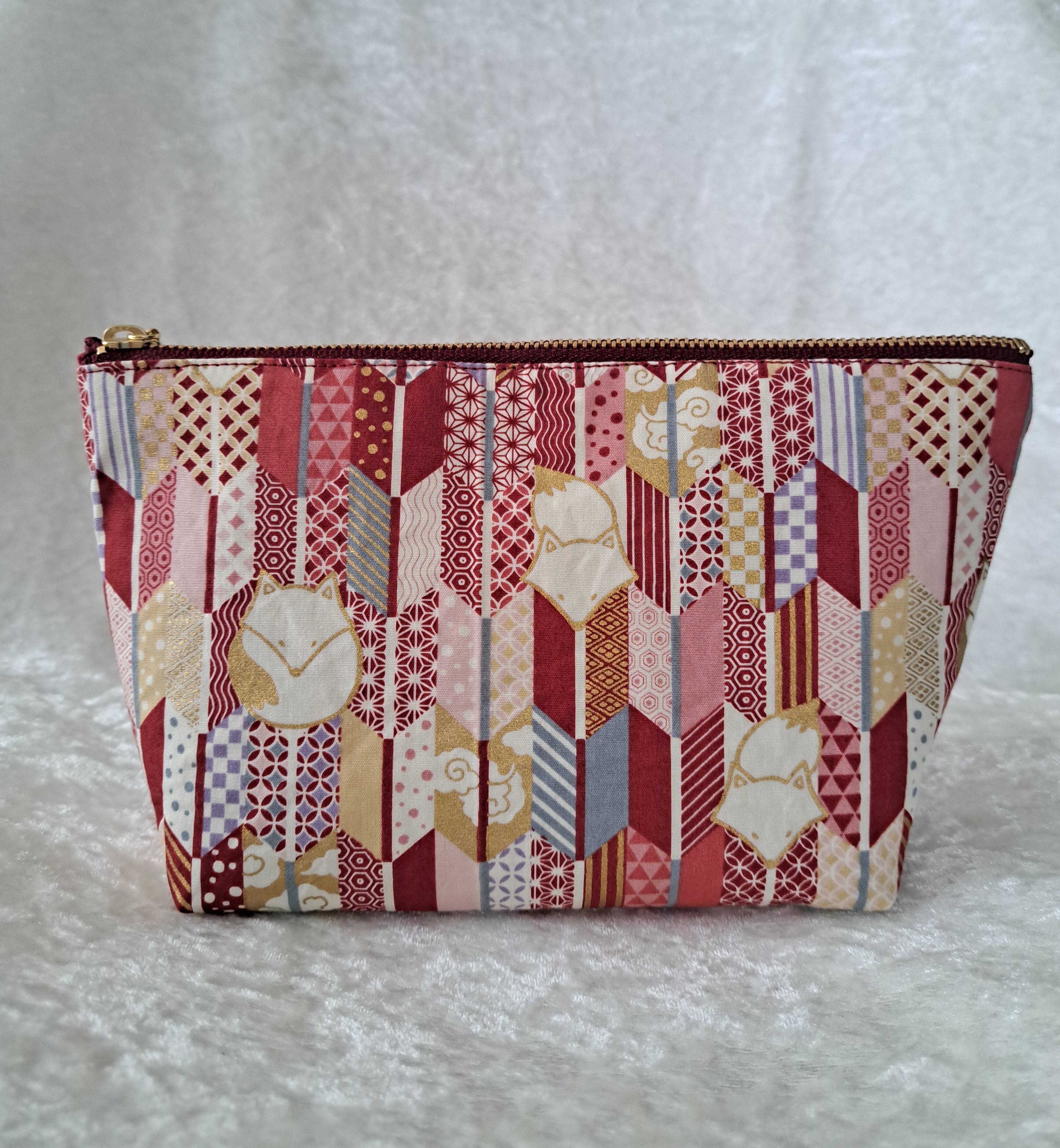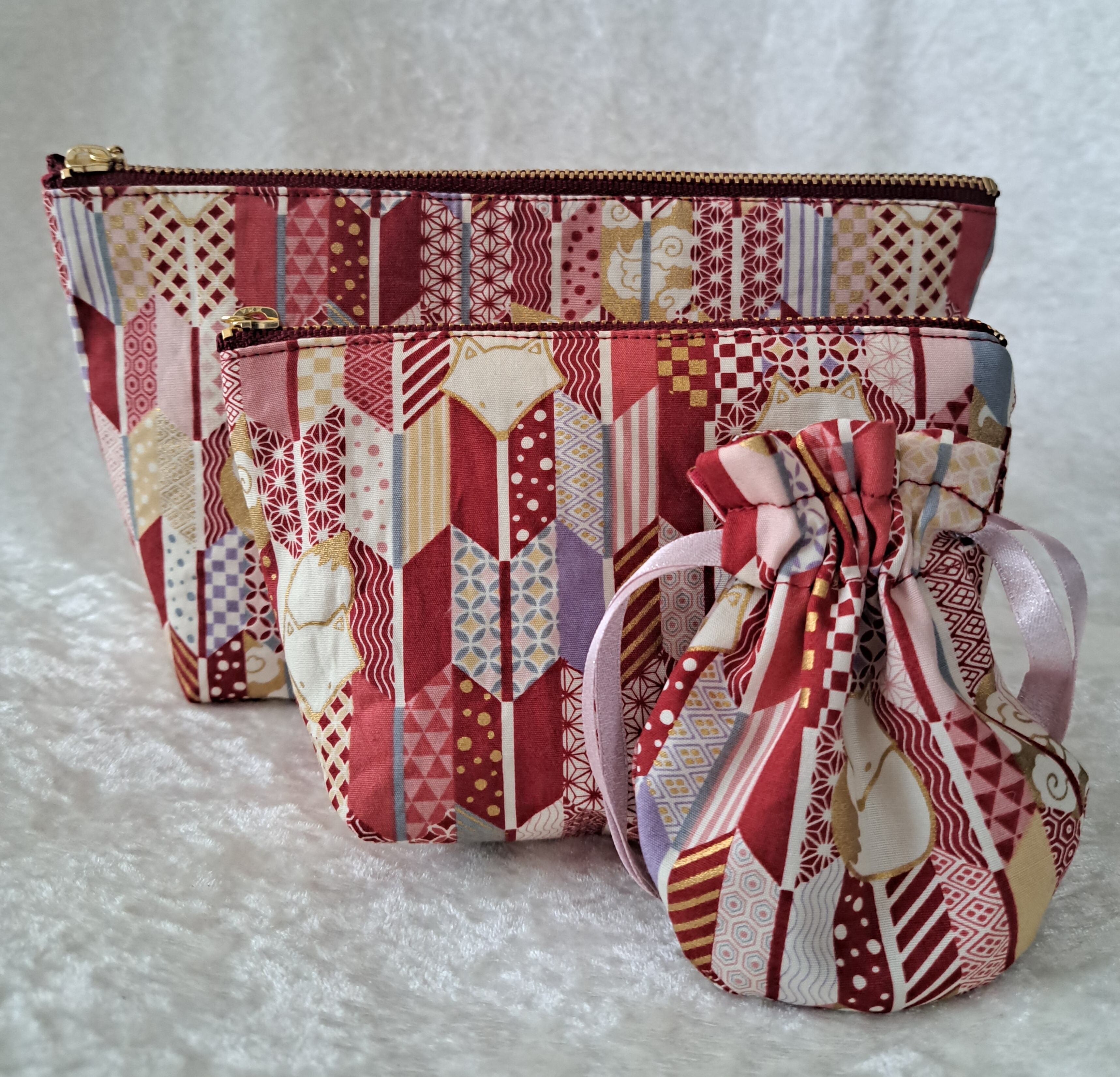和柄のファスナーポーチと、ミニ巾着の3点セットです。矢絣の中にいるきつねがかわいい柄になっています。