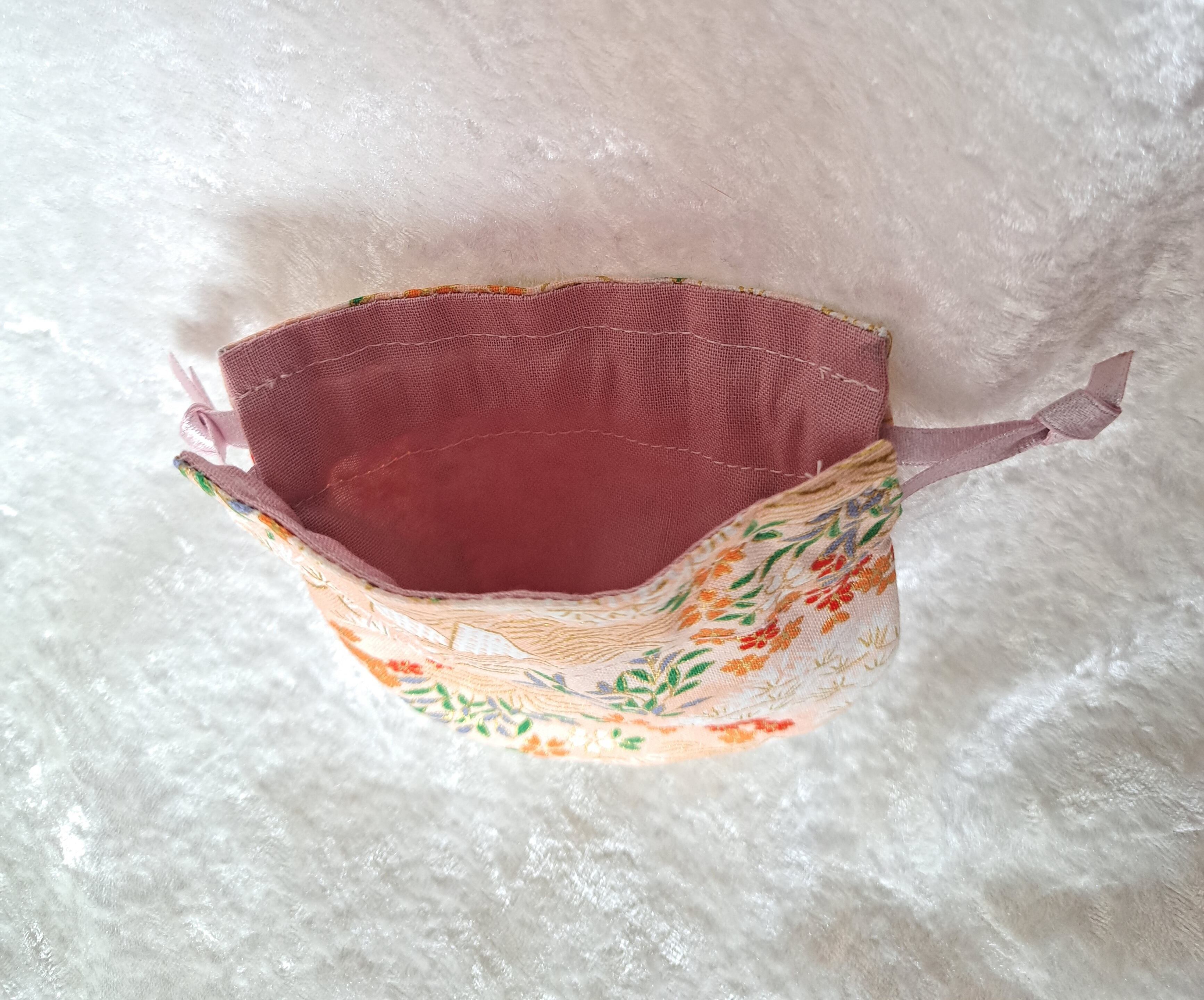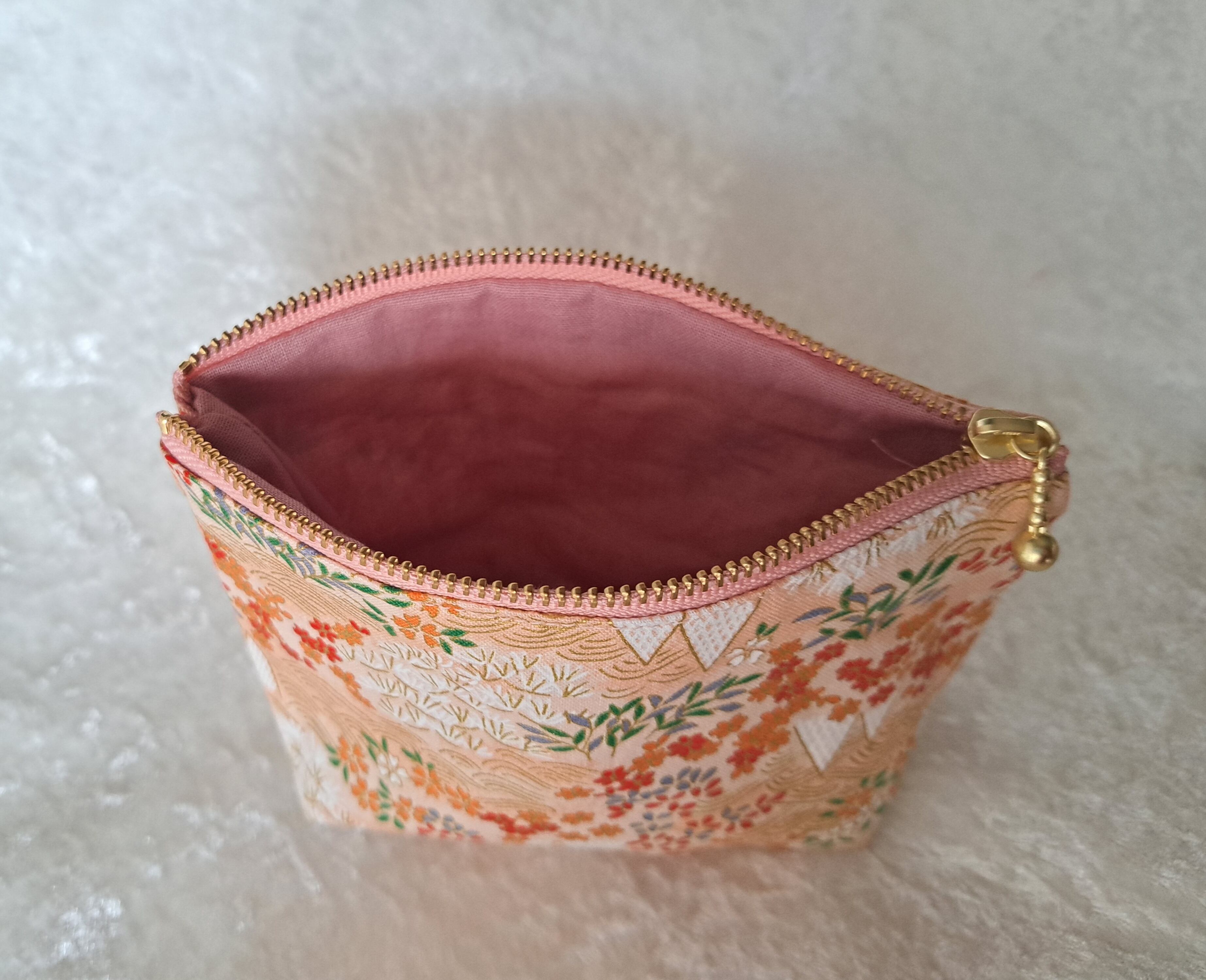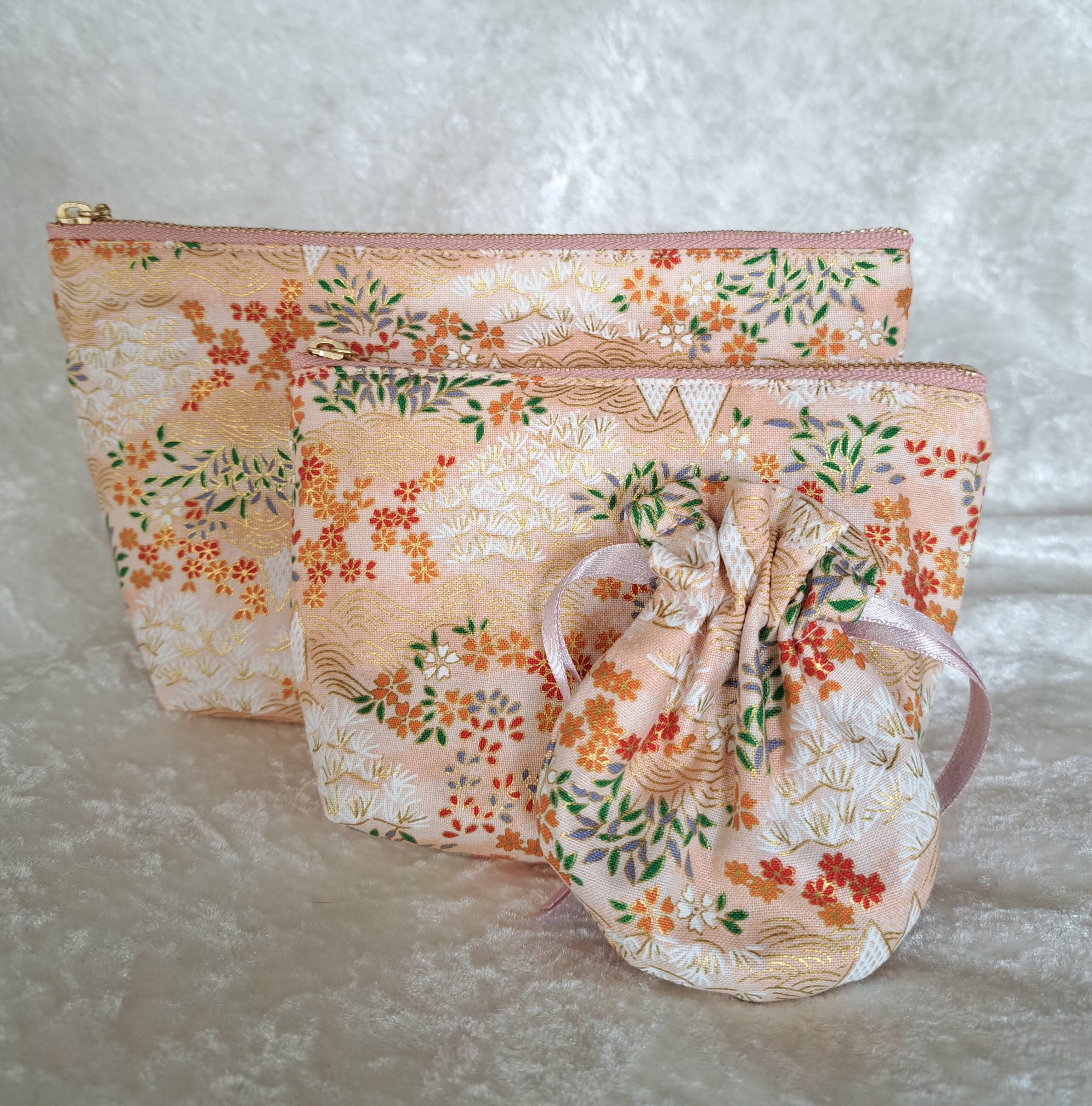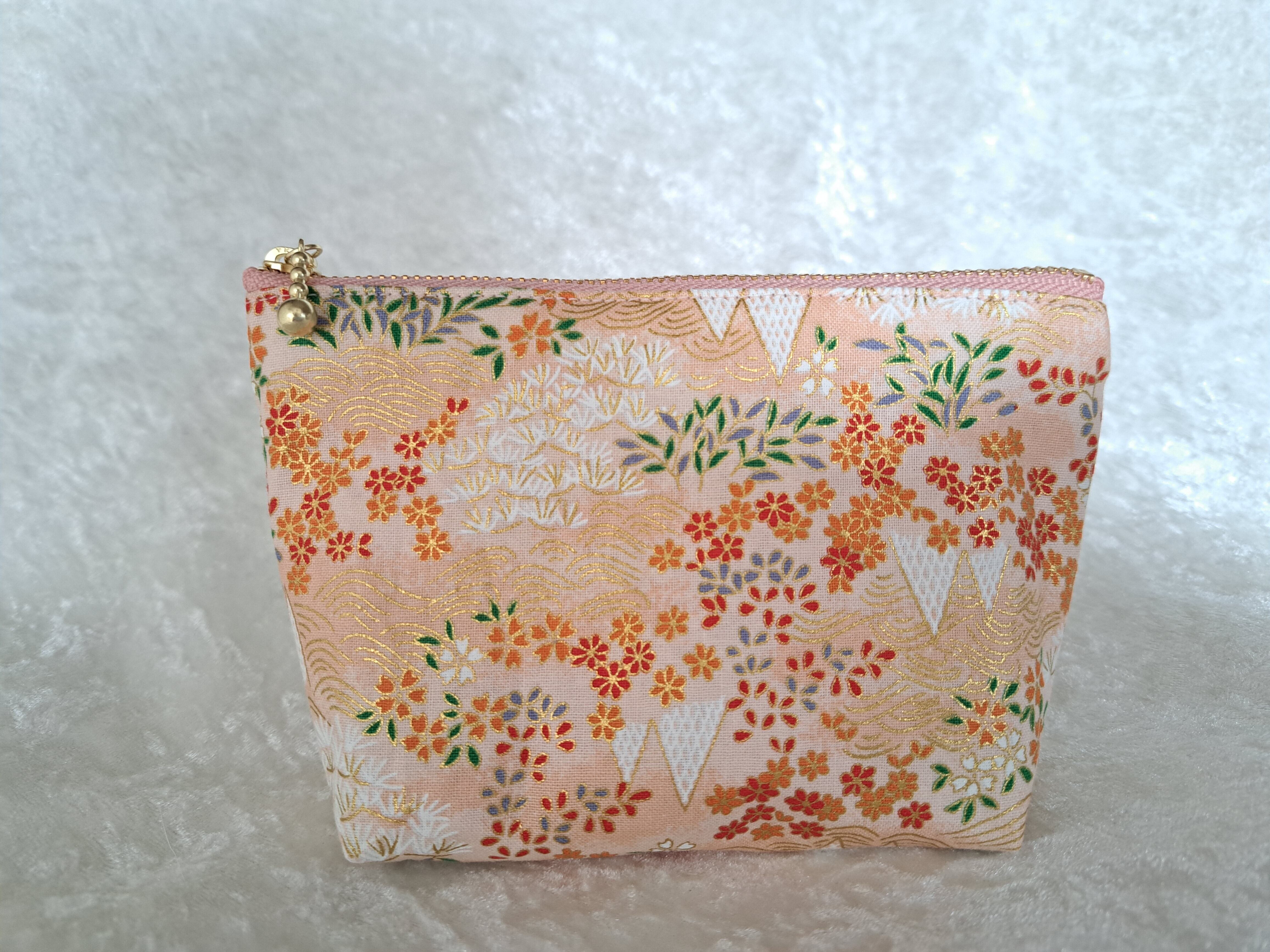 和柄のファスナーポーチと、ミニ巾着の3点セットです。着物や帯によくある、伝統的な柄に少し金色が入り、華やかで品のあるものになっております。