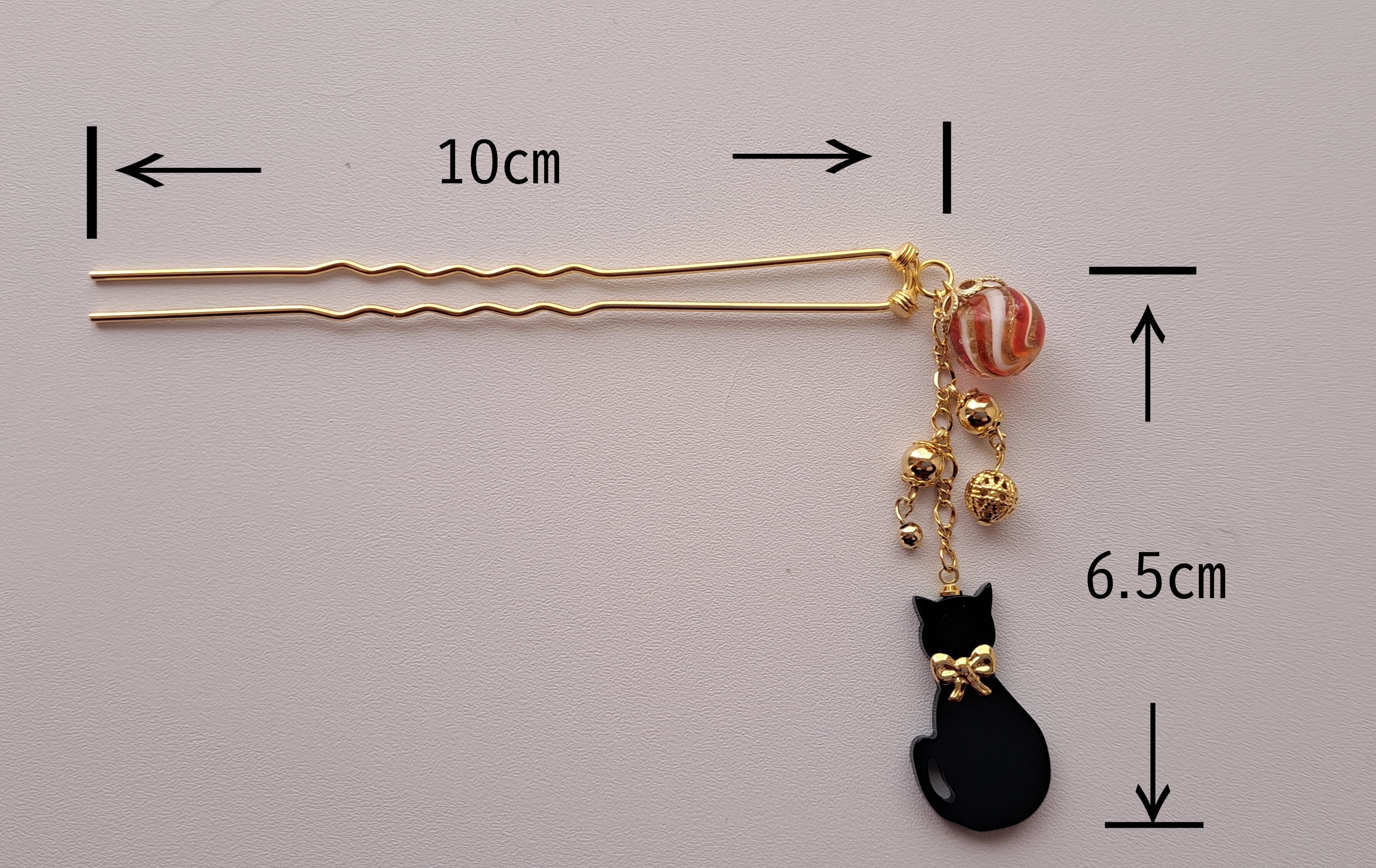 黒猫のパーツを、少しだけ和風感のあるかんざしにしてみました。赤みの入ったガラス玉を組み込んで、柔らかさを持たせました。