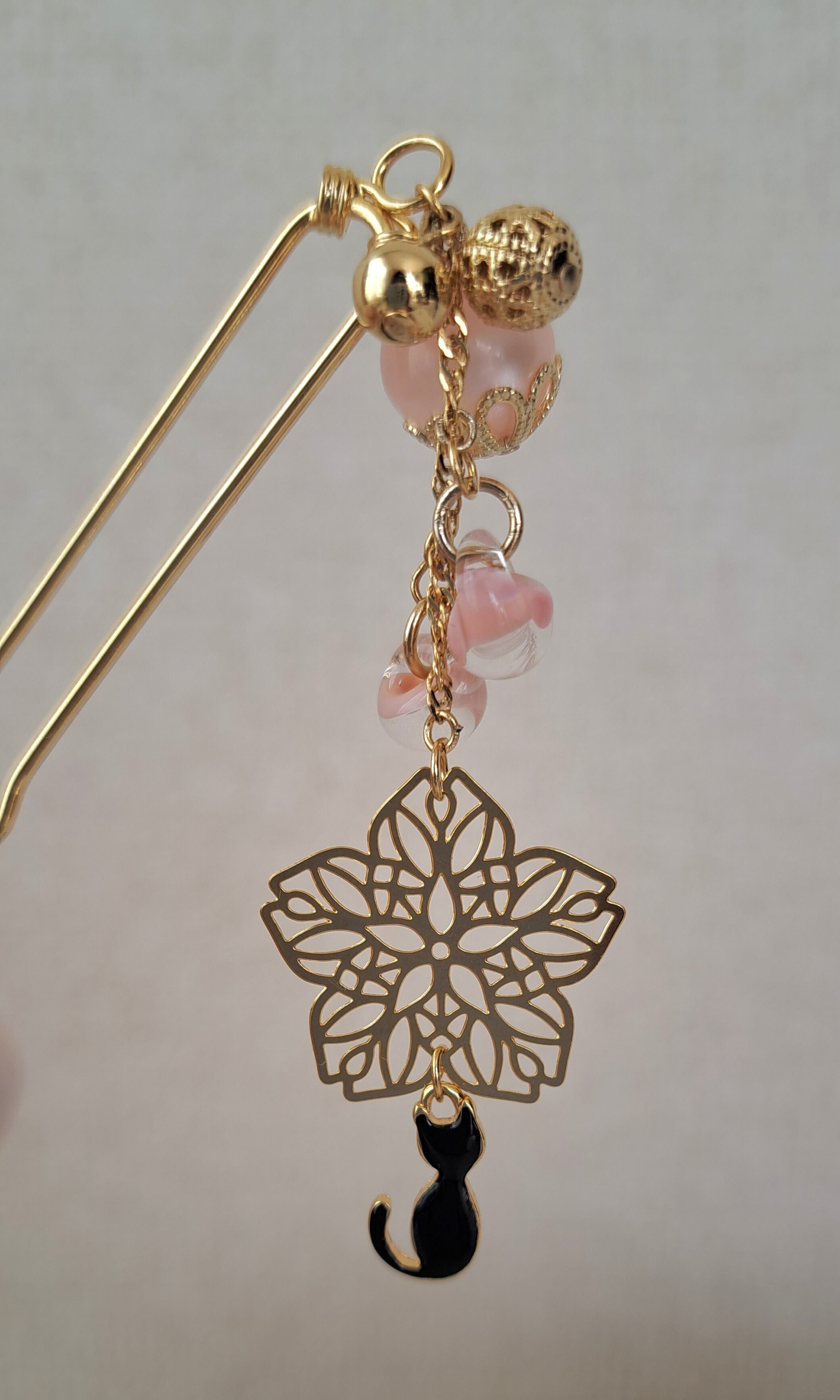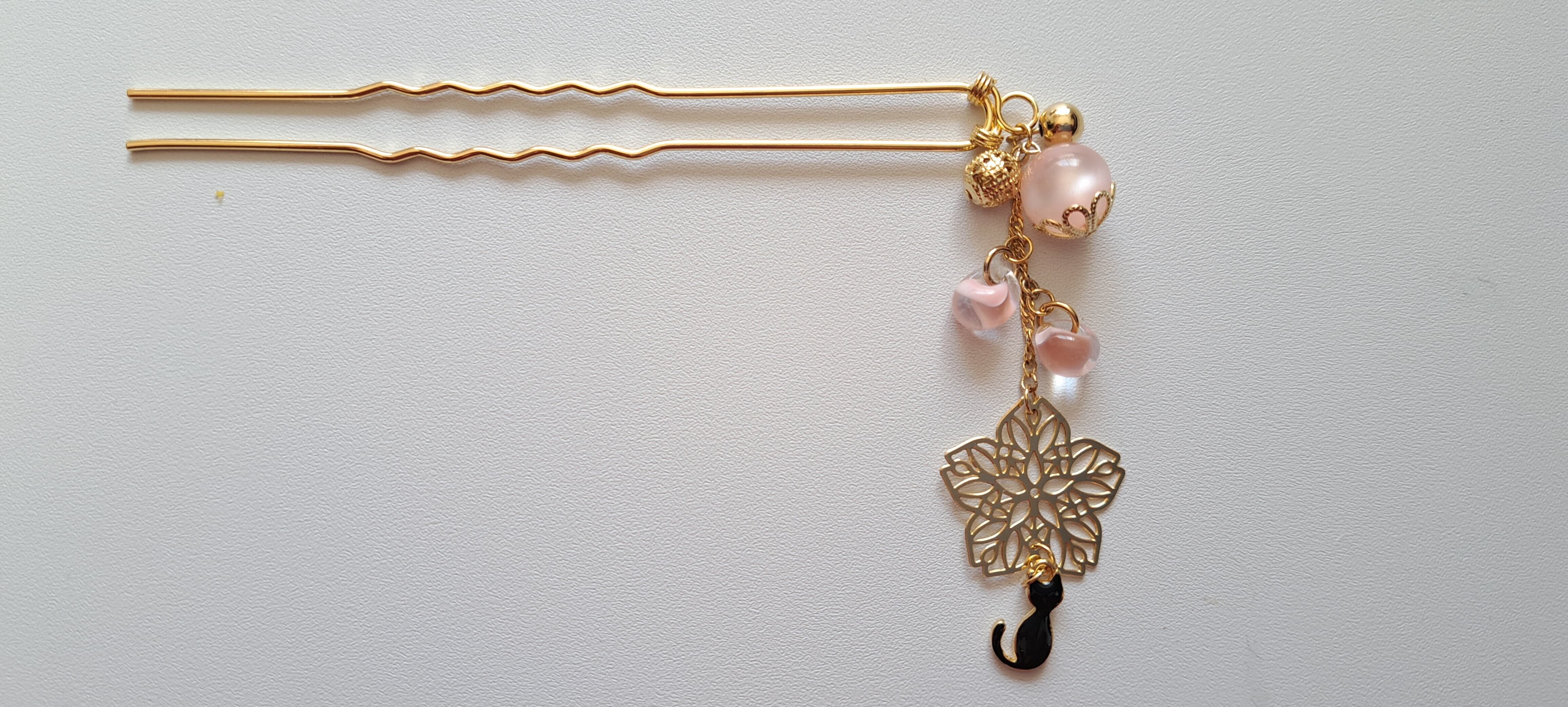 黒猫と桜をかんざしにしました。桜の花びらの様なビーズを組み合わせることで、可愛らしさもだしてみました。